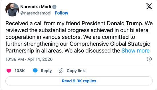 两位领导人上次通话是在3月24日,当时莫迪总理向特朗普转达了印度支持中东地区尽早实现降级和恢复和平的立场。两位领导人还讨论了保持霍尔木兹海峡开放、安全和可通行对世界的重要性。